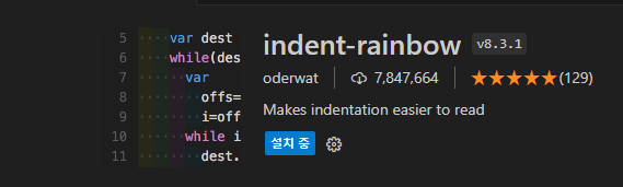 indent-rainbow를 설치하여 코드 칸별로 색상을 표시해서 가독성을 높혀준다.
