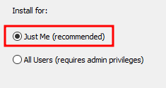 설치 과정 중 Select Installation Type에서 Just Me를 선택해야 환경변수 추가를 자동으로 선택할 수 있다.