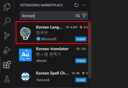 VS Code에서 설치하는 건 인터프리터가 아닌 다른 기능 지원(디버깅,코드탐색,주피터노트북 등등)을 위해 설치하는 것이다. 프로그램 한국어 버전을 위해 Korean Language Pack도 설치한다.