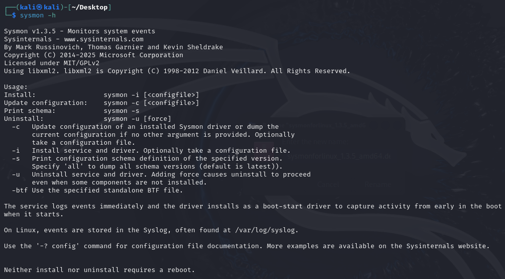 칼리 리눅스는 Debian 기반이므로 Ubuntu/Debian 패키지(sysmonforlinux_1.3.5_amd64.deb)를 설치하면 된다.