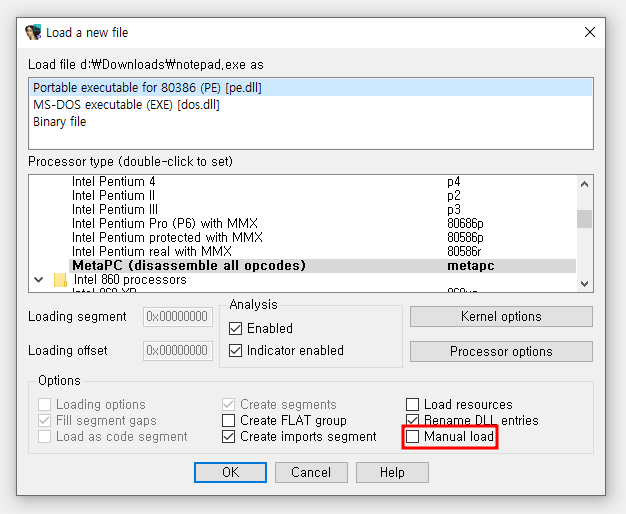 - IDA에서 바이너리를 로드할 때, Load options 창에서 "Manual load" 옵션을 체크