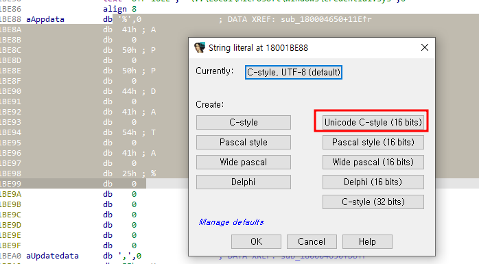 IDA에서 스트링을 해석할때 아래와 같은형태로 기본적으로 보여준다.