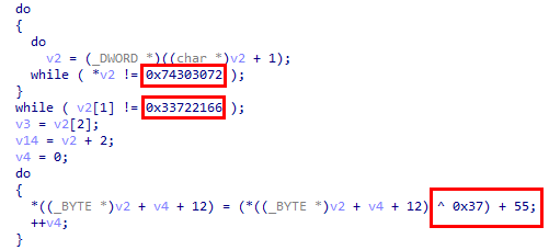 분석을 많이했다면 그냥 때려 맞출수 있는 수준이다. 시작점을 찾고 덤프 뜬 다음 0x37를 xor하고 55을 + 해주면 된다.