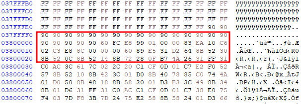 일단 쉘코드 초입에 많이 쓰는 90909090이라는 공백을 검색해보자. 거의 밑 부분에 존재하며, 90 다음에 60 FC 등은 PUSHAD 명령어로 거의 쉘코드로 의심해 볼 수 있다.