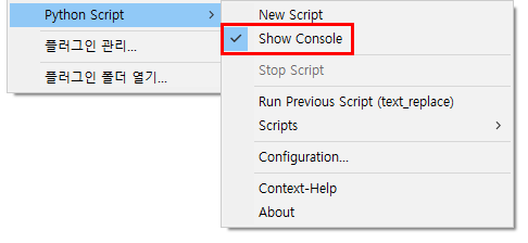 Python 3을 별도로 설치해도, Notepad++ 플러그인은 기본적으로 Python 2.7을 사용한다. 코드 작성 시 Python 2.7 문법에 맞춰 스크립트 작성하는 게 가장 안전하다. 스크립트 동작 중 콘솔창을 보면 오류 및 결과 로그를 확인 가능하다. 물론 콘솔 창이 없더라도 스크립트를 실행 시 콘솔 창이 자동 활성화 된다.