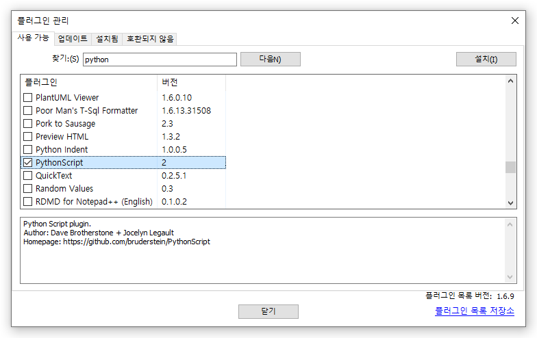 2. 플러그인에서 Python Script 설치